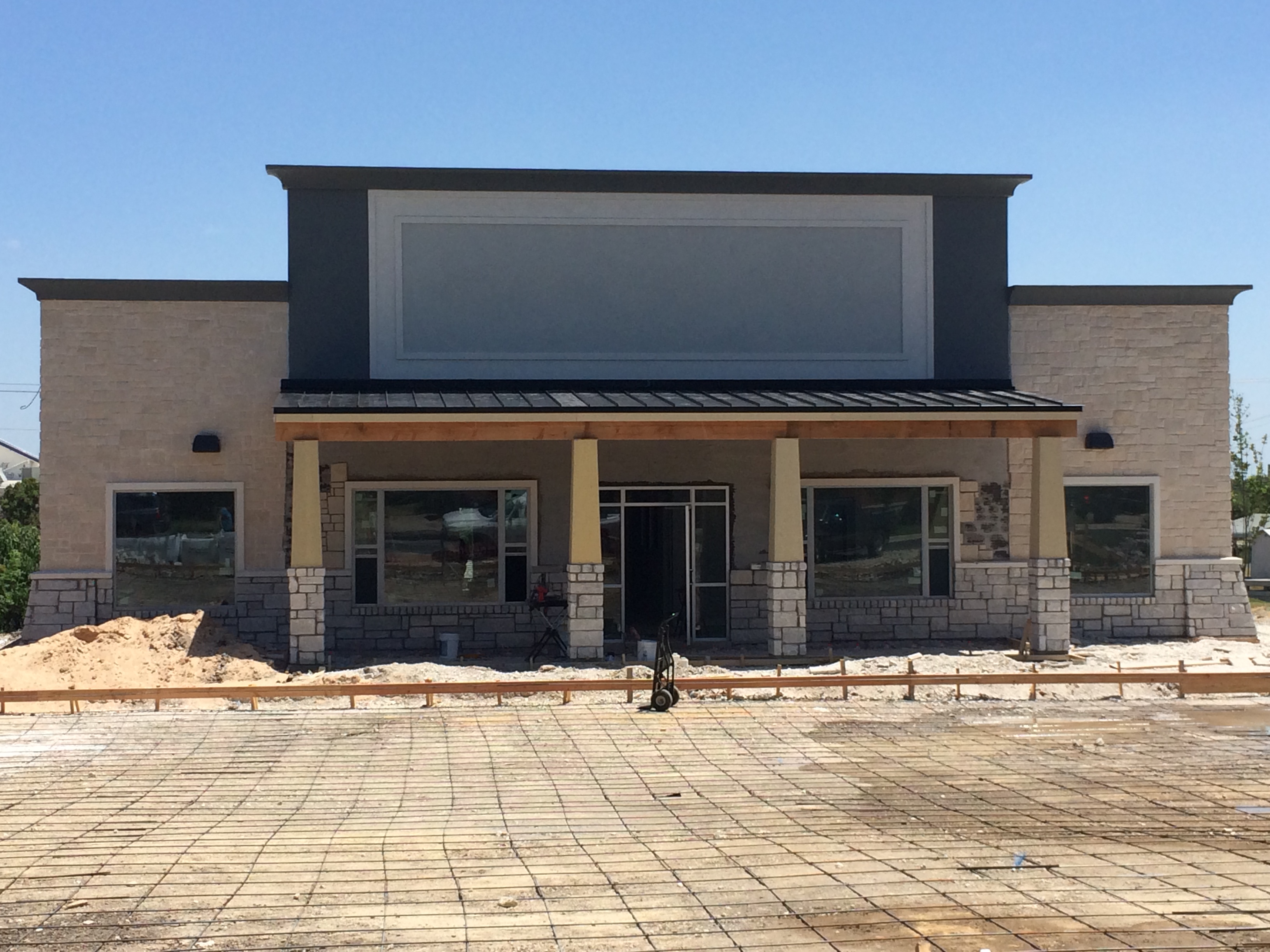 It’s starting to look a little more like the finished building. We will be painting the columns white and adding dark gray stucco under the canopy. I can’t wait to get our sign made and see our Center Stage logo sitting beautifully above the canopy centered in the light gray area. We are waiting to get our parking lot and patio poured. After that, they will be able to work on the landscaping.